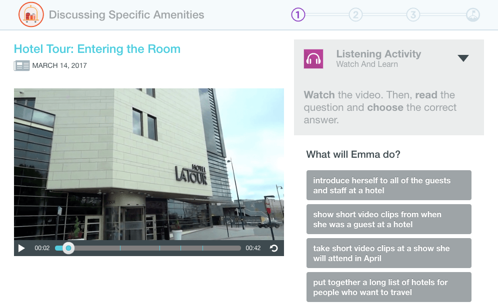 With career-aligned courses, your learners can study exactly what they need to know, with authentic content that’s always up to date. Check out the screenshot below to see an example lesson from the English for Tourism & Hospitality course.