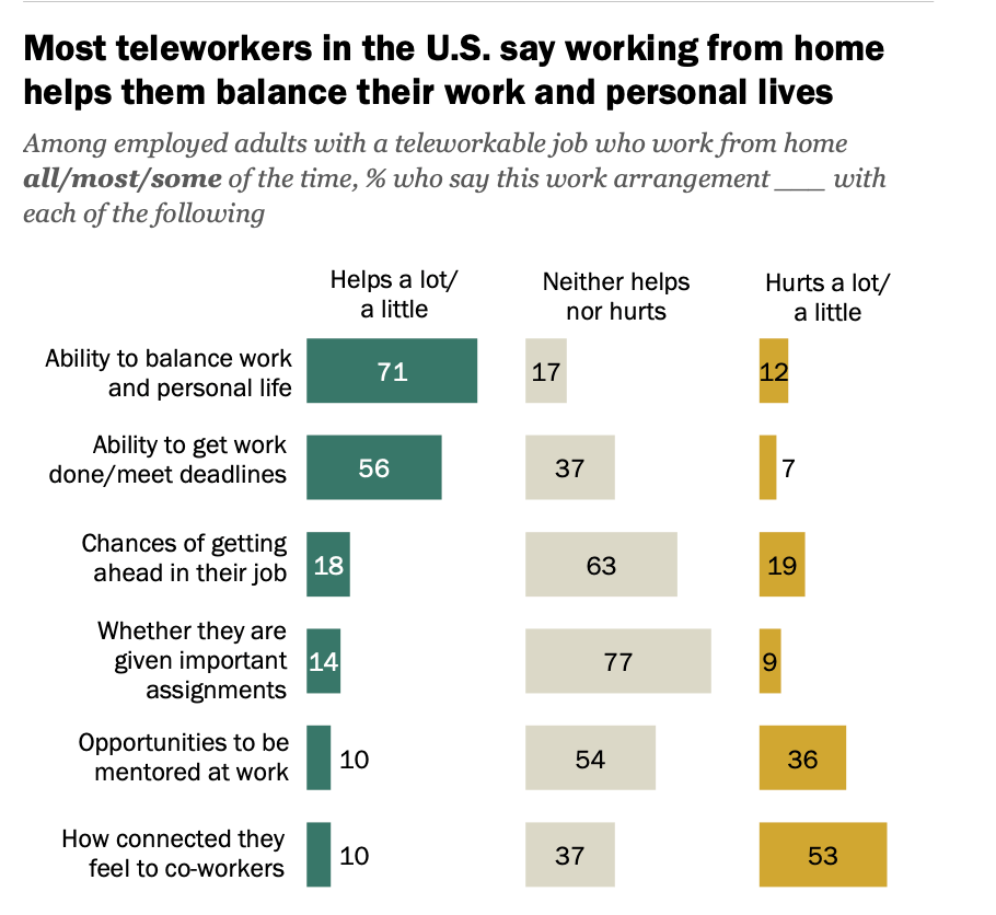 There are gains in personal life, but losses in terms of connection: in a survey of remote workers in the United States, 36% of respondents stated that remote work hampers mentoring opportunities, and 53% reported feeling less connected to their colleagues.