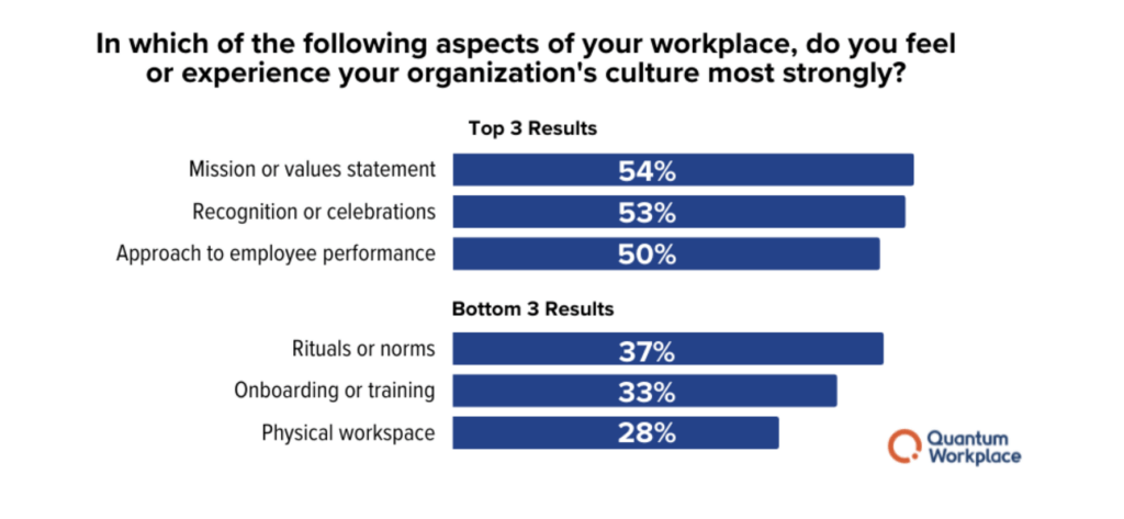 E o que os trabalhadores levam em consideração ao avaliar a cultura da organização? De acordo com o levantamento realizado pela Quantum Workplace, os valores da empresa e como ela reconhece e avalia seus trabalhadores são os maiores influenciadores de uma cultura forte.
