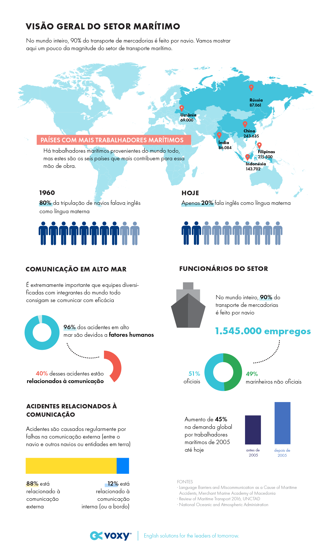 A demanda global por trabalhadores marítimos cresceu 45% desde 2005. Com essa demanda crescente, os profissionais de recursos humanos têm enfrentado grandes desafios de contratação, especialmente para os postos em que a comunicação a bordo se torna um fator crítico. Ao todo, 40% dos acidentes marítimos são causados por falhas de comunicação. Isso significa que a proficiência em inglês dos tripulantes adquire especial importância.